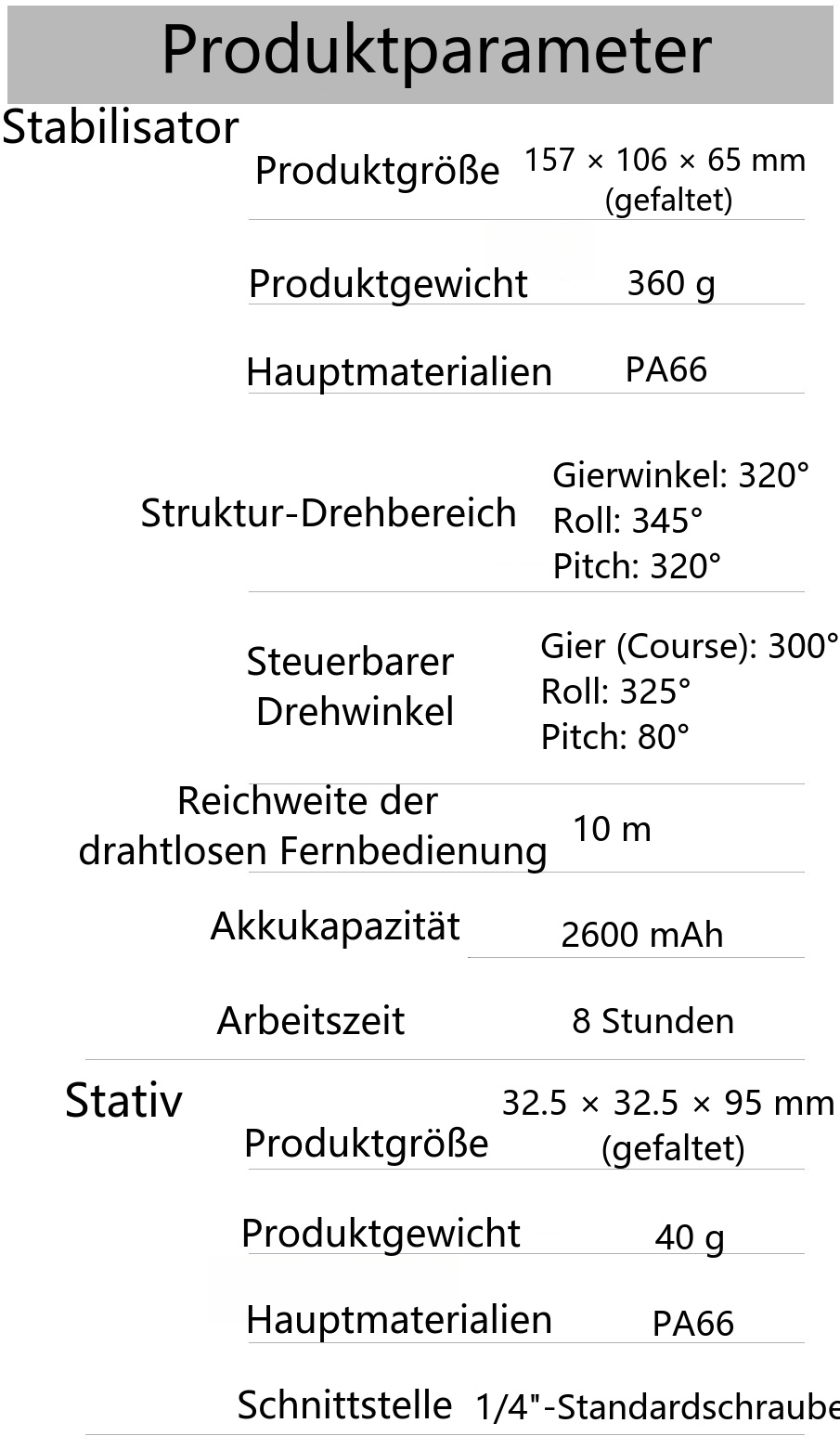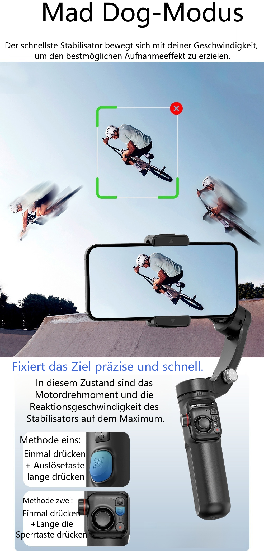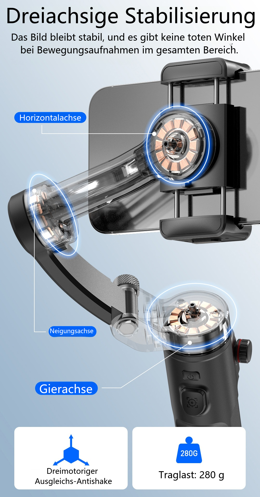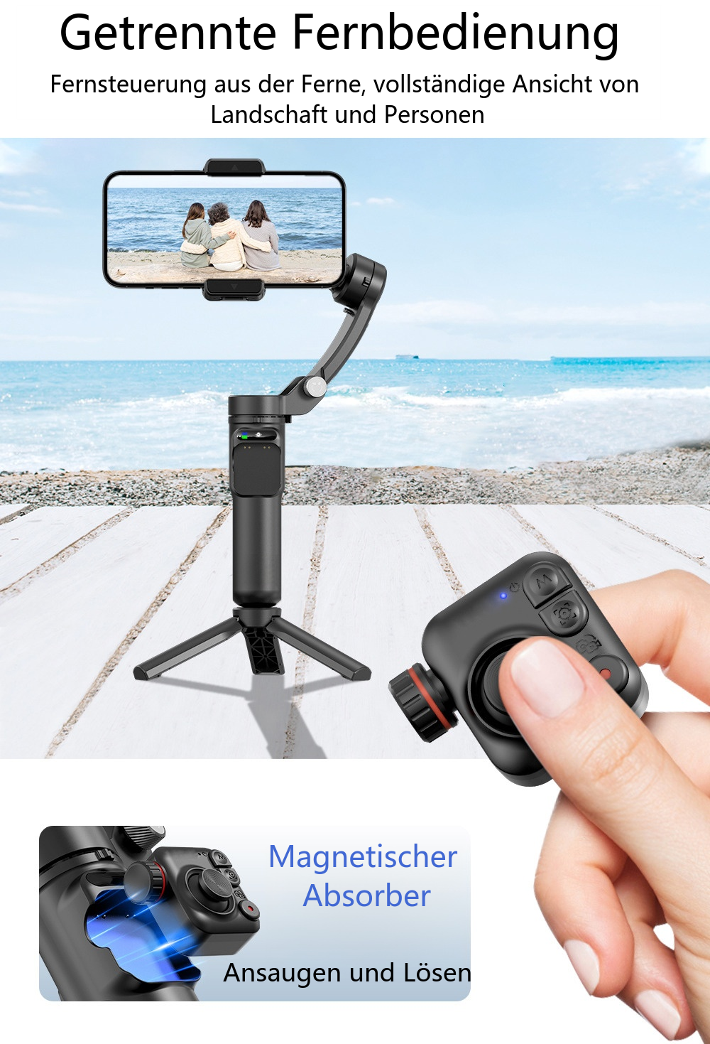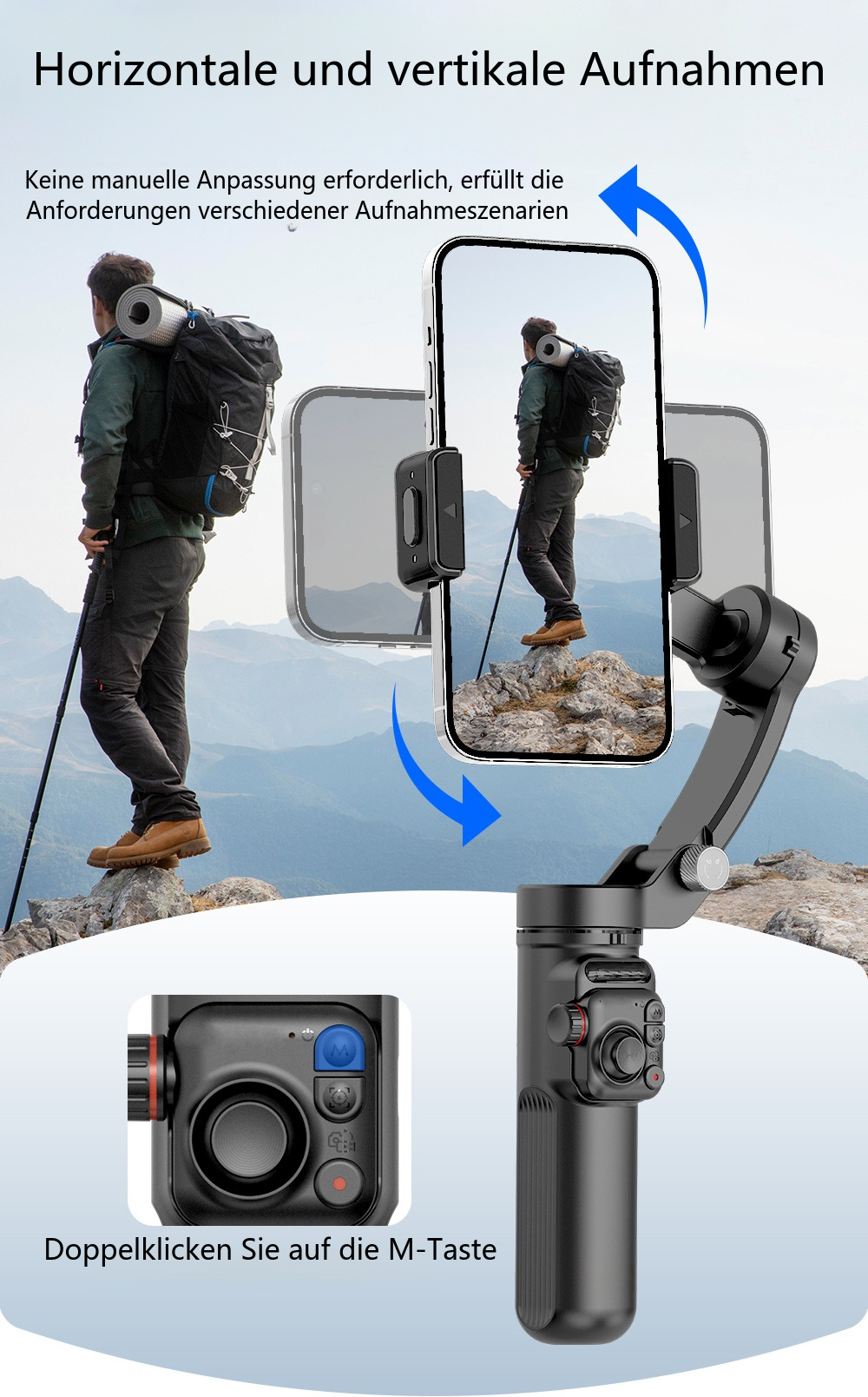 Erfassen Sie jeden Moment mit makelloser Präzision. Unser Smartphone-Gimbal-Stabilisator eliminiert unerwünschte Erschütterungen und sorgt für flüssige, kinoreife Aufnahmen – selbst unterwegs. Mit 360°-Tracking und intelligenter Stabilisierungstechnologie garantiert er vollständige Abdeckung – kein Winkel bleibt unentdeckt, kein Moment geht verloren. Ob beim Vloggen, Livestreaming oder beim Filmen Ihres nächsten Abenteuers – genießen Sie mühelose Kontrolle und Ergebnisse in professioneller Qualität direkt mit Ihrem Smartphone.