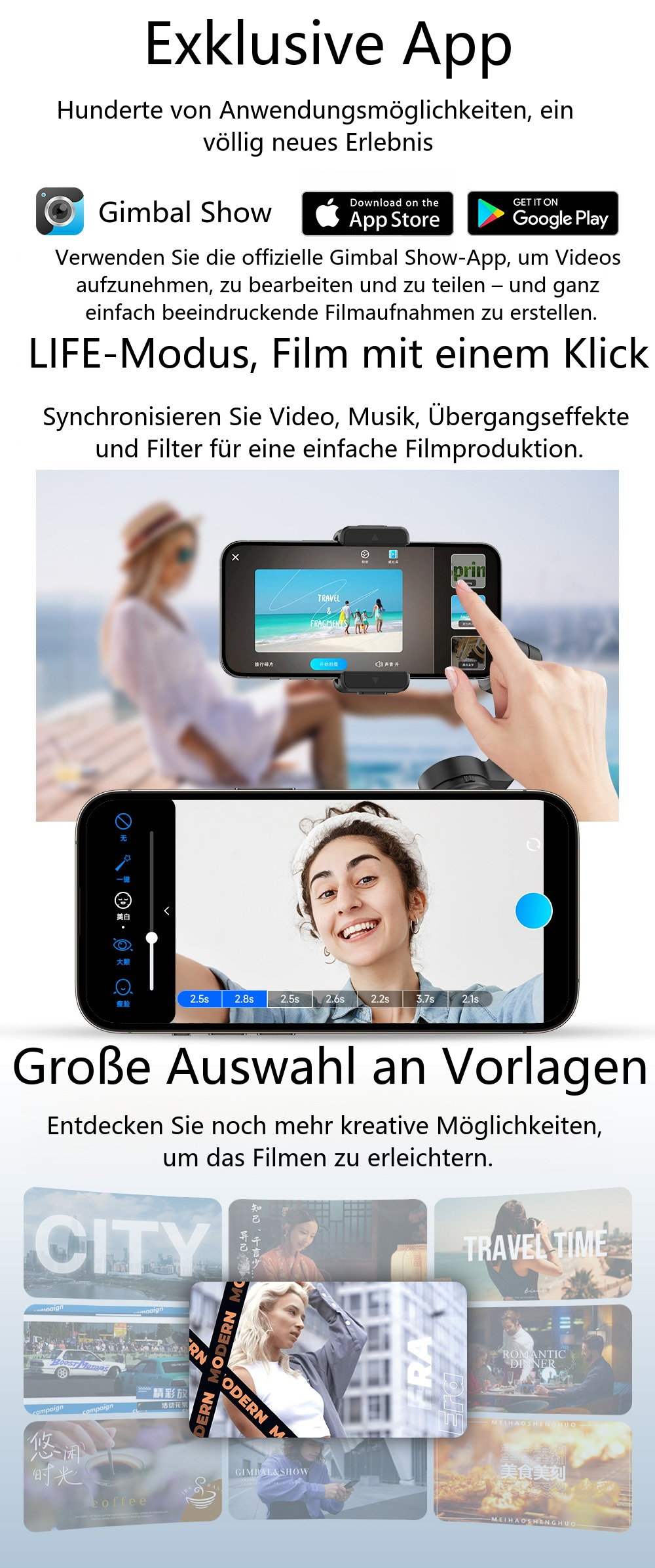 Verwandeln Sie Ihre Aufnahmen in Sekundenschnelle in beeindruckende Videos. Mit unserer speziell entwickelten Begleit-App können Sie Ihre Clips bearbeiten, schneiden, Filter, Musik und Spezialeffekte hinzufügen – alles mit nur einem Klick. Keine professionellen Kenntnisse erforderlich. Verbinden Sie Ihren Smartphone-Gimbal nahtlos mit der App und nutzen Sie intelligente Funktionen wie Gestensteuerung, KI-Tracking und kreative Aufnahmemodi. Vom Aufnehmen bis zum Erstellen – alles geht mühelos. Geben Sie Ihren Geschichten jederzeit und überall einen professionellen Feinschliff, der sie hervorstechen lässt.