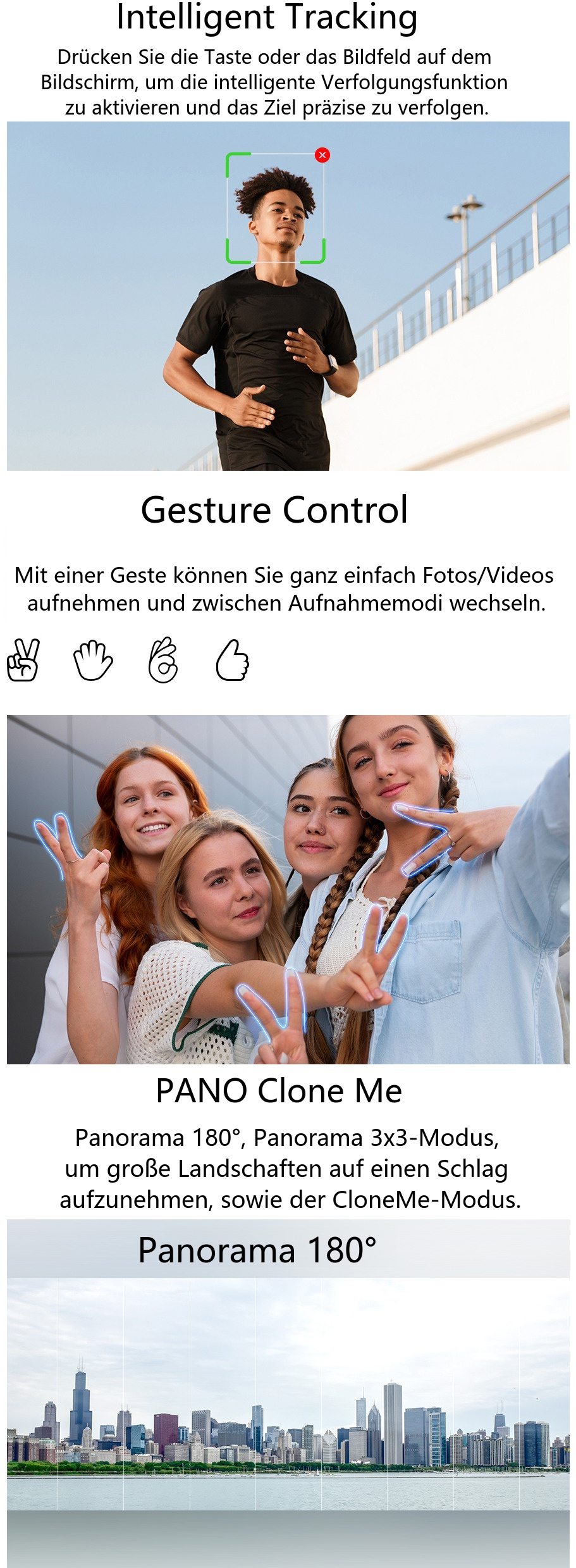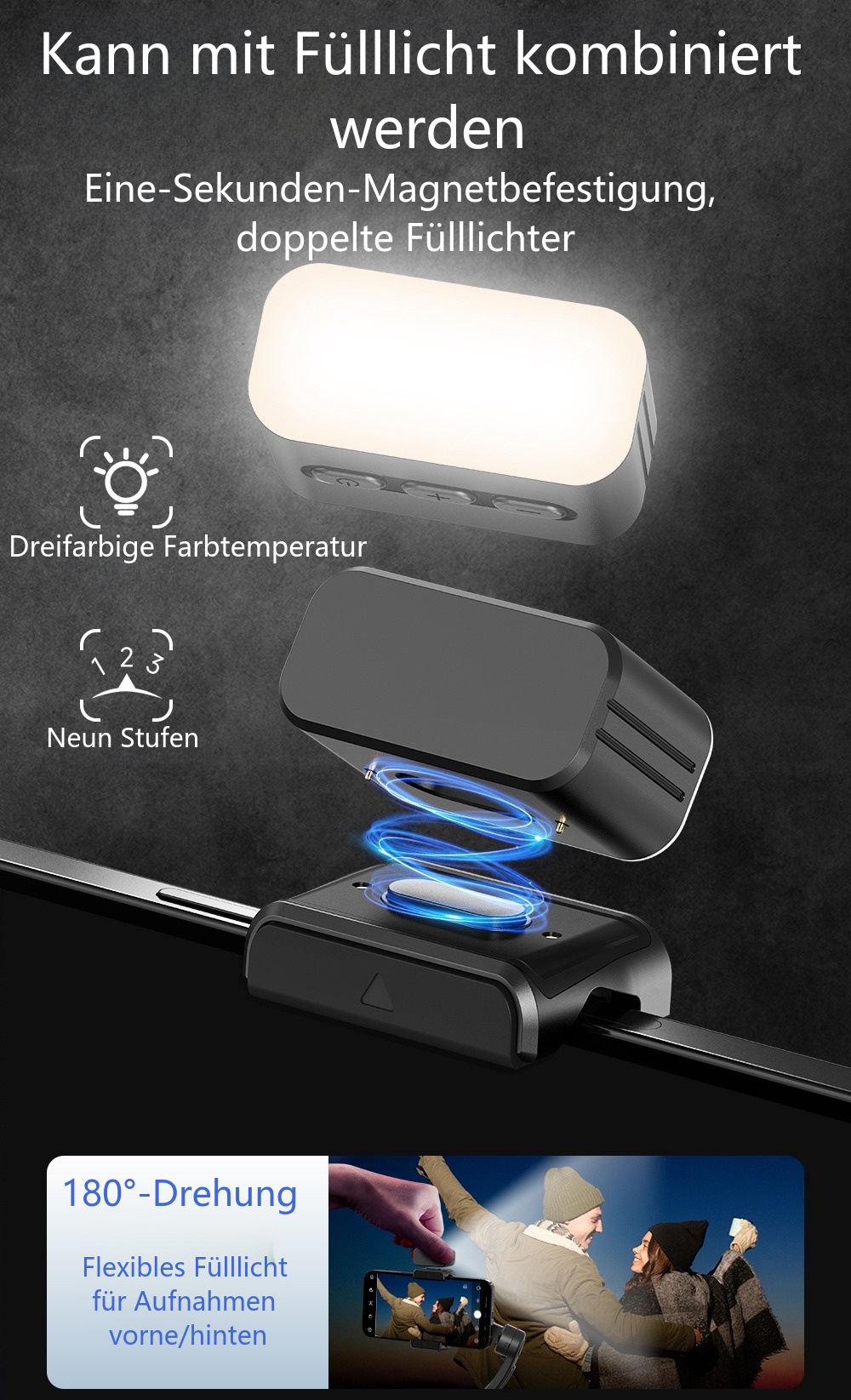 Es ist mit einem Fülllicht ausgestattet, das Sie heller erstrahlen lässt, sowie mit einer KI-Tracking-Kamera, die automatisch folgt und das Ziel erfasst, ganz ohne Bedienung über eine App.